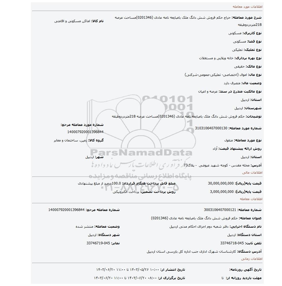 شرح مورد معامله: حراج حکم فروش شش دانگ ملک بامبایعه نامه عادی (0201346)مساحت عرصه 218متردردوطبقه | نام کالا: اماکن مسکونی و اقامتی | |