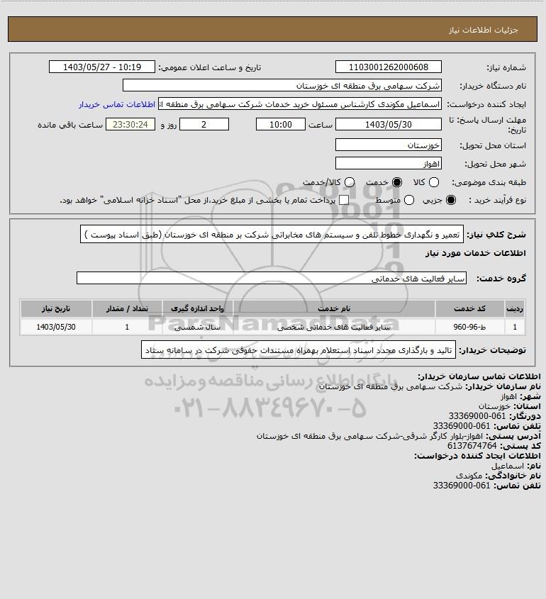 شرح کلی نیاز: تعمیر و نگهداری خطوط تلفن و سیستم های مخابراتی شرکت بر منطقه ای خوزستان (طبق اسناد پیوست )