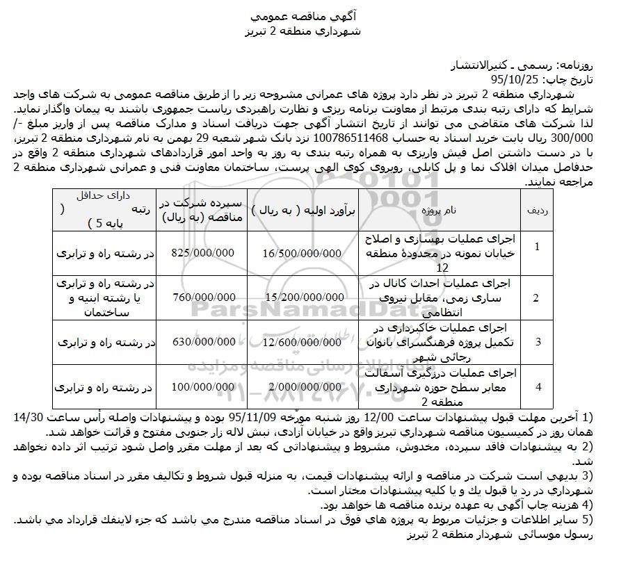شهرداری منطقه 2 تبریز در نظر دارد پروژه های عمرانی مشروحه زیر را از طریق مناقصه عمومی به شرکت های واجد شرایط که دارای رتبه بندی مرتبط از معاونت برنامه ریزی و نظارت راهبردی ریاست جمهوری باشند به پیمان واگذار نماید. لذا شرکت های متقاضی می توانند از تاریخ انتشار آگهی جهت دریافت اسناد و مدارک مناقصه پس از واریز مبلغ 300.000 ریال بابت خرید اسناد به حساب 100786511468 نزد بانک شهر شعبه 29 بهمن به نام شهرداری منطقه 2 تبریز، با در دست داشتن اصل فیش واریزی به همراه رتبه بندی به روز به واحد امور قراردادهای شهرداری منطقه 2 واقع در حدفاصل میدان افلاک نما و پل کابلی، روبروی کوی الهی پرست، ساختمان معاونت فنی و عمرانی شهرداری منطقه 2 مراجعه نمایند.