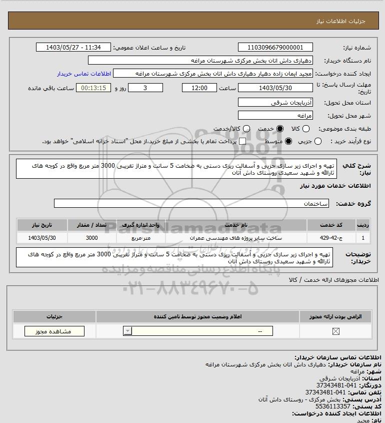 شرح کلی نیاز: تهیه و اجرای زیر سازی جزیی و آسفالت ریزی دستی به ضخامت 5 سانت و متراژ تقریبی 3000 متر مربع واقع در کوچه های ثارالله و شهید سعیدی روستای داش آتان