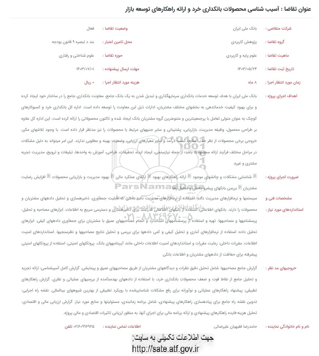 استعلام بها و موضوع استعلام فراخوان آسیب شناسی محصولات بانکداری خرد و ارائه راهکارهای توسعه بازار به اطلاع کلیه شرکتها و افراد متخصص واجد شرایط میرساند، آگهی گذار در نظر دارد از طریق استعلام بها، نسبت به انتخاب و دریافت پیشنهادات اقدام نماید. این استعلام با کد آگهی ثبت شده در سامانه خبرگزاری پارس نماد : 7879433 منتشر شده است. مشخصات استعلام : تاریخ شروع استعلام: 1403/05/27 آخرین مهلت ارسال پیشنهاد قیمت : 1403/07/01 و محل اجرای پروژه : استان سایر میباشد. استعلام قیمت مورد درخواست : فراخوان آسیب شناسی محصولات بانکداری خرد و ارائه راهکارهای توسعه بازار با دستهبندیهای تخصصی و گروه های مرتبط : مشاوره تحقیقات و مدیریت استاندارد, استعلام اطلاع رسانی میگردد.