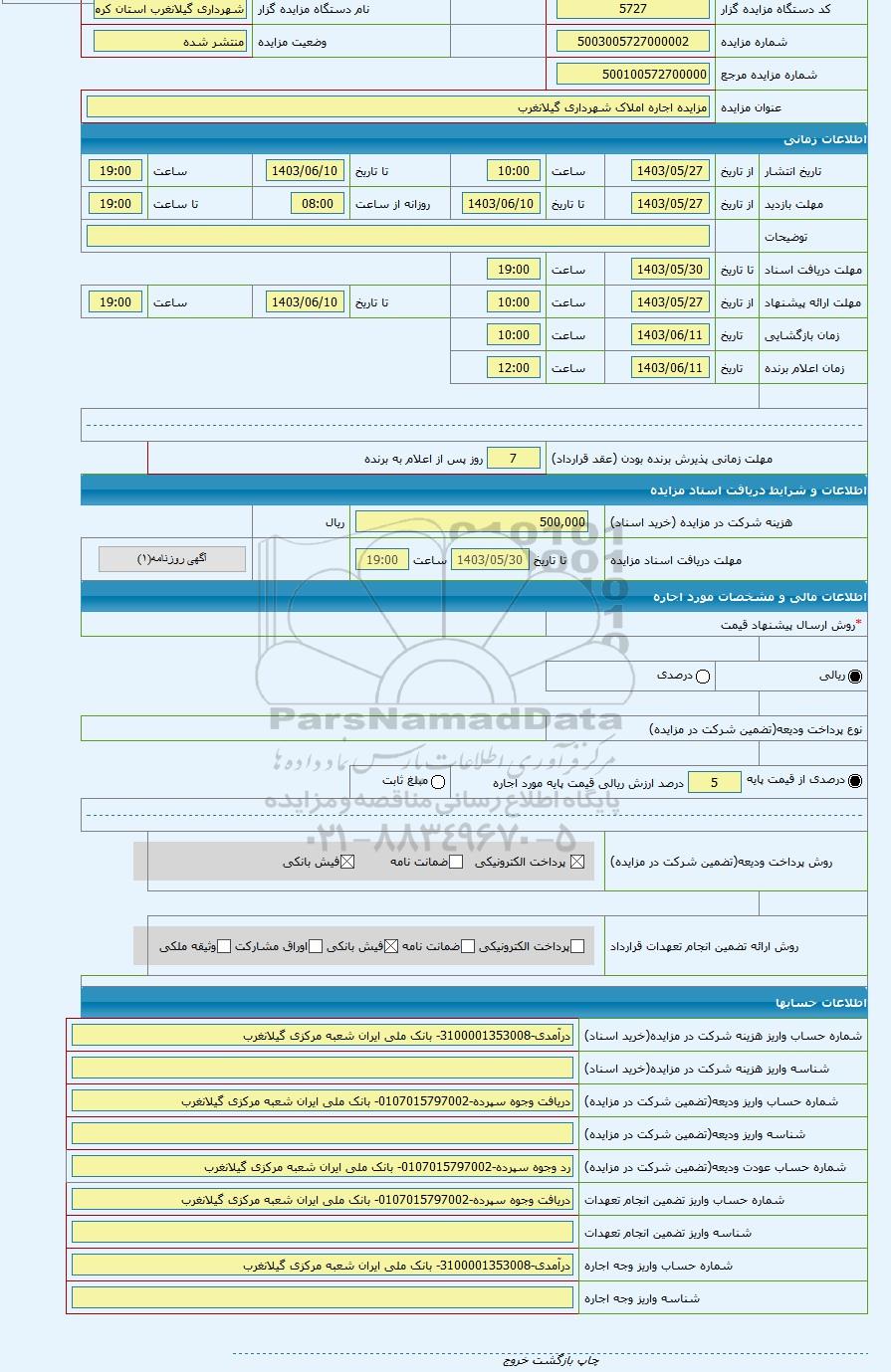 | عنوان مزایده | مزایده اجاره املاک شهرداری گیلانغرب | |||