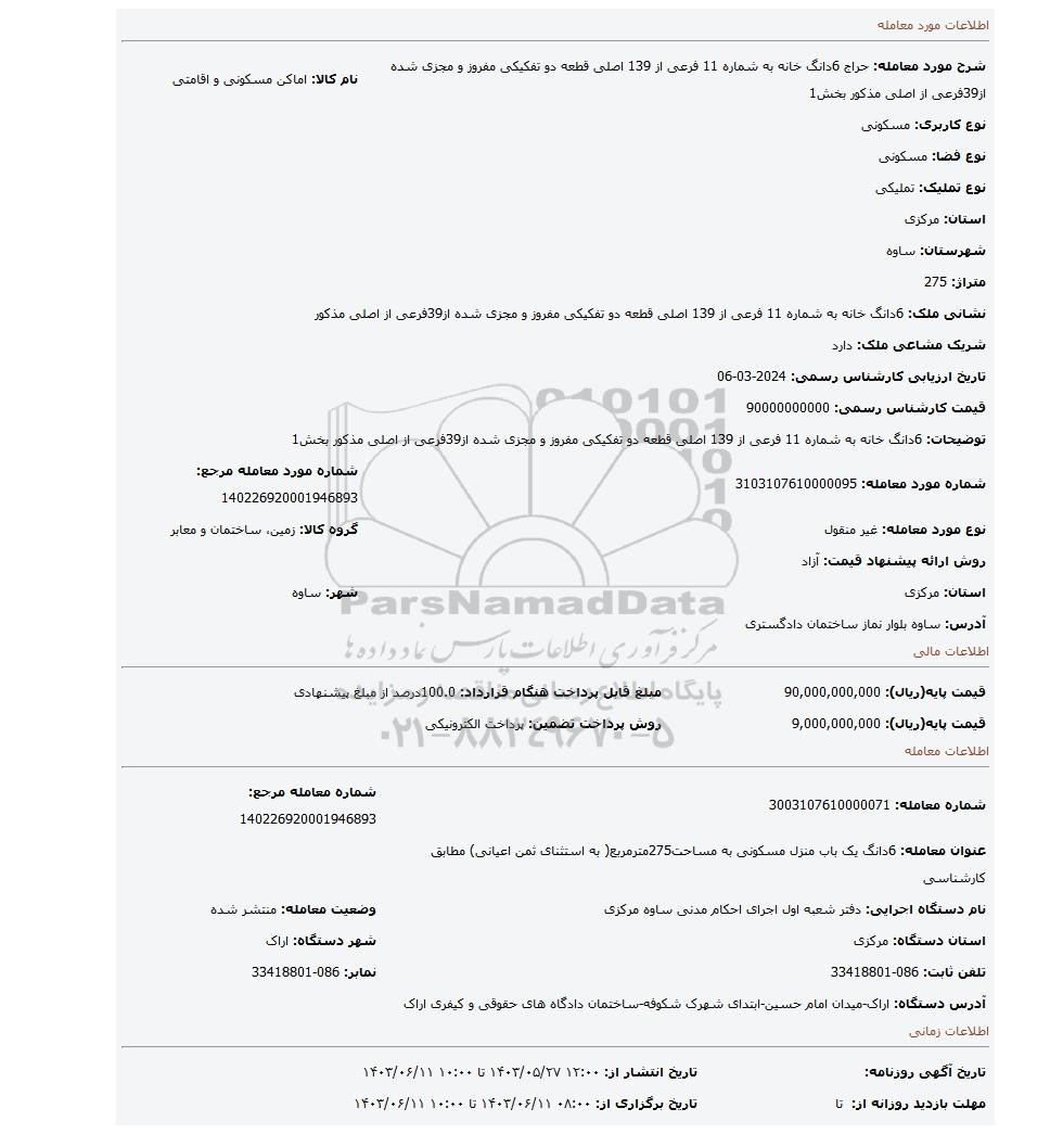 عنوان معامله: 6دانگ یک باب منزل مسکونی به مساحت275مترمربع( به استثنای ثمن اعیانی) مطابق کارشناسی
