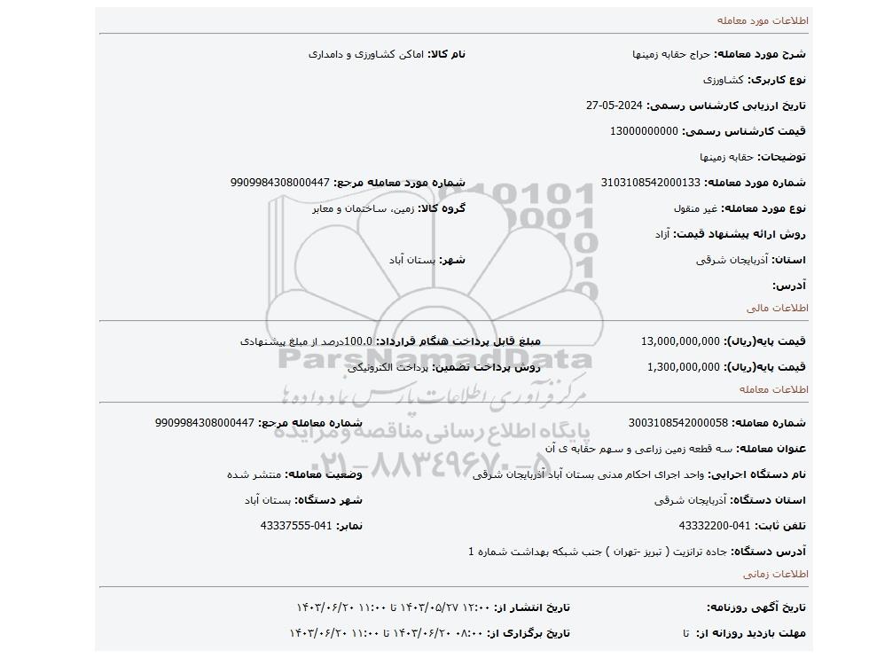 | شرح مورد معامله: حراج حقابه زمینها | نام کالا: اماکن کشاورزی و دامداری | |