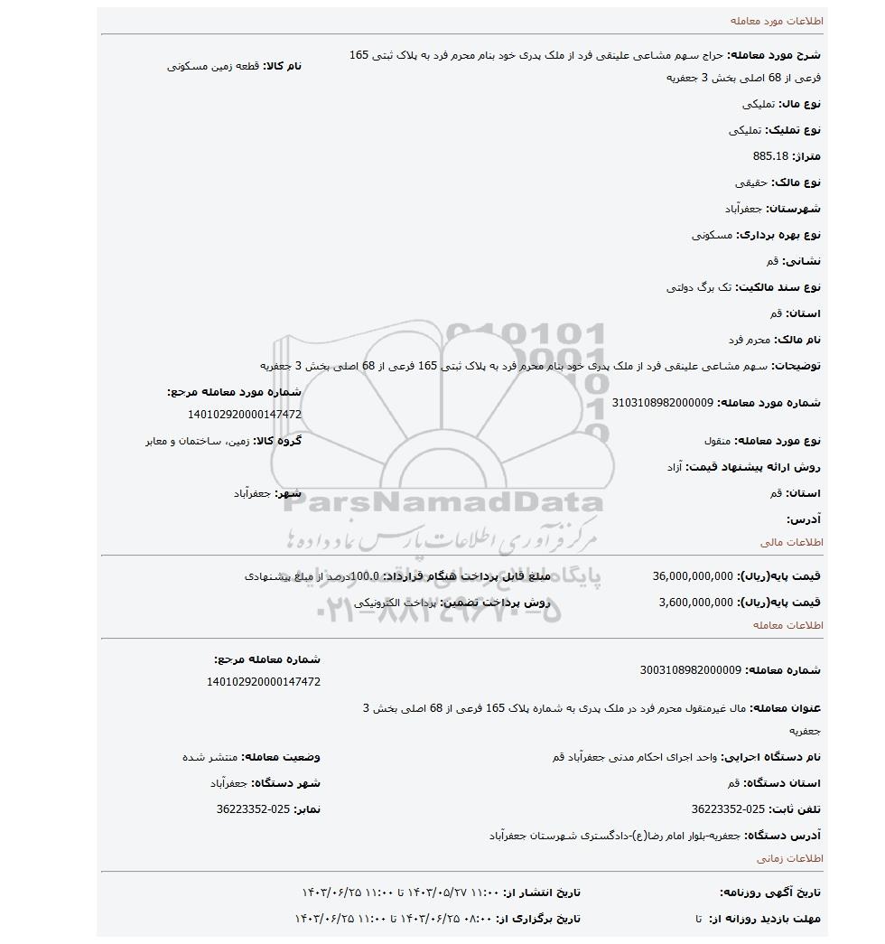 مزایده سهم مشاعی علینقی فرد از ملک پدری خود بنام محرم فرد به پلاک ثبتی 165 فرعی از 68 اصلی بخش 3 جعفریه, مزایده، سهم مشاعی علینقی فرد از ملک پدری خود بنام محرم فرد به پلاک ثبتی 165 فرعی از 68 اصلی بخش 3 جعفریه