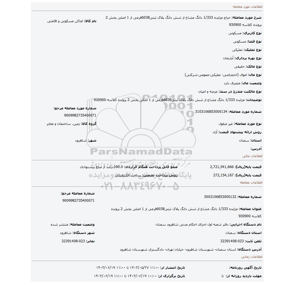 شرح مورد معامله: حراج مزایده 1/333 دانگ مشاع از شش دانگ پلاک ثبتی6038فرعی از 1 اصلی بخش 2 پرونده کلاسه 930900نام کالا: اماکن مسکونی و اقامتی