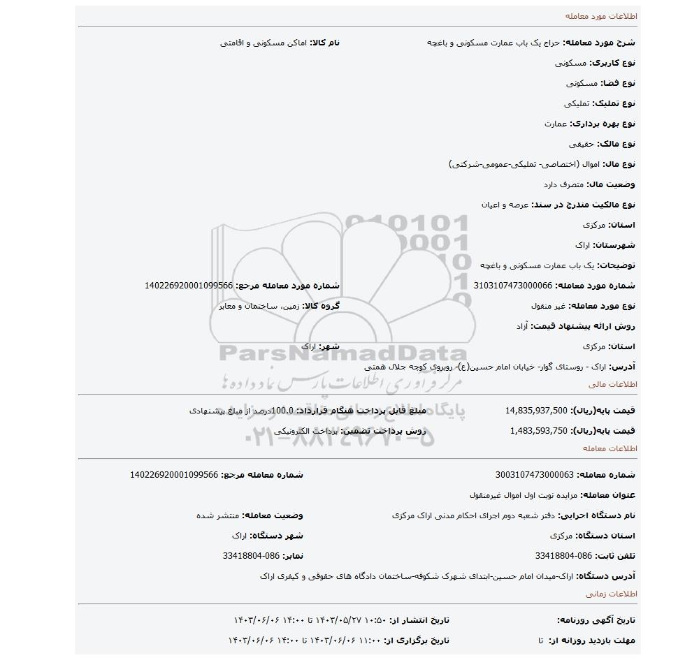 | شرح مورد معامله: حراج یک باب عمارت مسکونی و باغچه | نام کالا: اماکن مسکونی و اقامتی | |