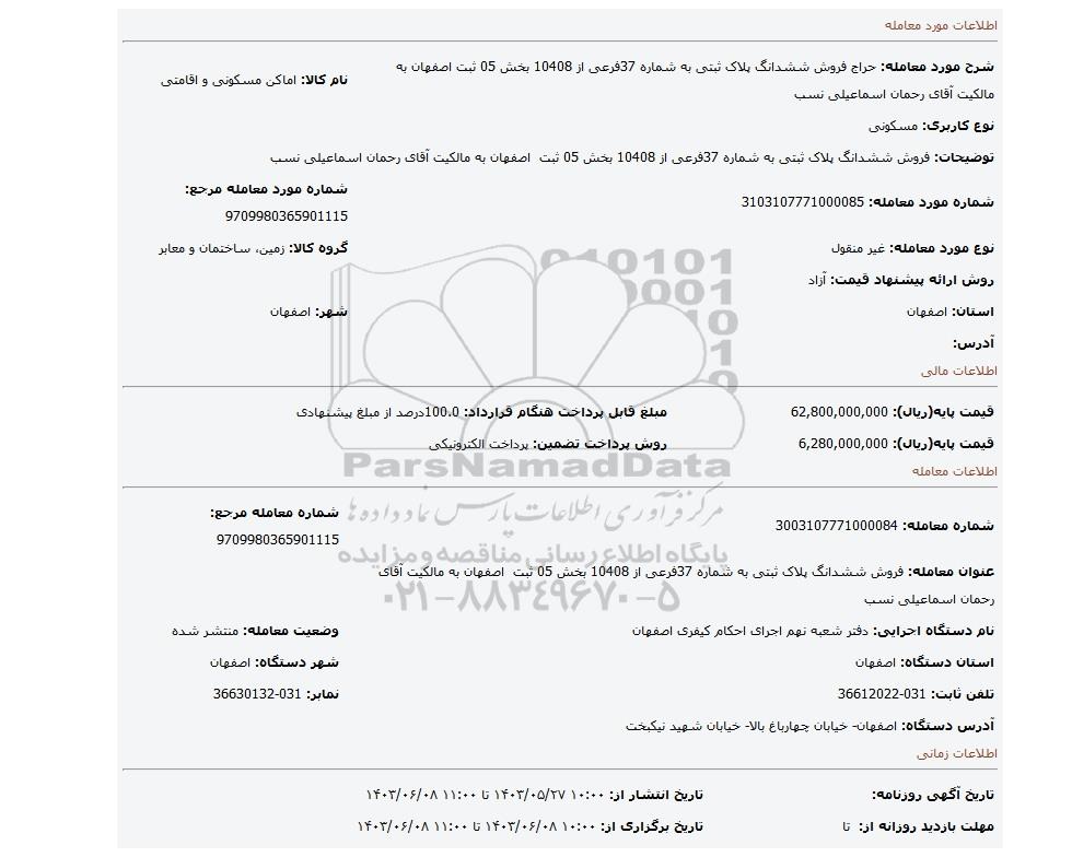 عنوان معامله: فروش ششدانگ پلاک ثبتی به شماره 37فرعی از 10408 بخش 05 ثبت  اصفهان به مالکیت آقای رحمان اسماعیلی نسب