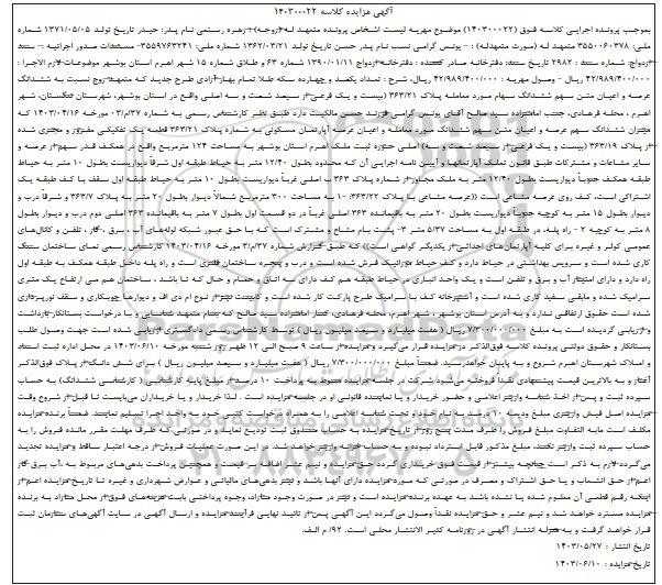 متن آگهی: آگهی مزایده کلاسه 140300022 بموجب پرونده اجرایی کلاسه فوق (140300022) موضوع مهریه لیست اشخاص پرونده : متعهد له (زوجه) : -زهره رستمی نام پدر: حیدر تاریخ تولد: 05/05/1371 شماره ملی: 3550060378متعهد له (مورث متعهدله) : - یونس گرامی نسب نام پدر: حسن تاریخ تولد: 21/03/1362شماره ملی: 3559763241-مستندات صدور اجرائیه : - سند ازدواج : شماره سند : 2982، تاریخ سند : دفترخانه صادر کننده : دفترخانه ازدواج11/01/1390 شماره 63 و طلاق شماره 15 شهر اهرم استان بوشهر موضوعات لازم الاجرا : 42/989/400/000 ریال - وصول مهریه : 42/989/400/000 ریال ، شرح : تعداد یکصد و چهارده سکه طلا تمام بهار آزادی طرح جدید که متعهد زوج نسبت به ششدانگ عرصه و اعیان متن سهم: ششدانگ سهام مورد معامله پلاک 363/21 (بیست و یک فرعی از سیصد شصت و سه اصلی)واقع در استان بوشهر ، شهرستان تنگستان ، شهر اهرم ، محله فرهادی ، جنب امامزاده سید صالح آقای یونس گرامی فرزند حسن مالکیت دارد، طبق نظر کارشناس رسمی به شماره 37/م/03 مورخه 1403/04/16 که میزان ششدانگ سهم عرصه و اعیان متن سهم: ششدانگ مورد معامله عرصه و اعیان آپارتمان مسکونی به شماره پلاک 363/21 قطعه یک تفکیکی مفروز و مجزی شده از پلاک 363/19 (بیست و یک فرعی از سیصد شصت و سه اصلی)حوزه ثبت ملک اهرم استان بوشهر به مساحت 124 متر مربع واقع در همکف قدر سهم از عرصه و سایر مشاعات و مشترکات طبق قانون تملک آپارتمان ها و آیین نامه اجرایی آن که محدود است به حدود شمالاٌ دیواریست بطول 12/40 متر به حیاط طبقه اول شرقاٌ دیواریست بطول 10 متر به حیاط طبقه همکف جنوباٌ دیواریست بطول 12/40 متر به ملک مجاور از شماره پلاک 363 ب اصلی غرباٌ دیواریست بطول 10 متر به حیاط طبقه اول سقف با کف طبقه یک اشتراکی است ، کف روی عرصه مشاعی است ((عرصه مشاعی با پلاک 363/22 : 1- به مساحت 300 متر مربع شمالاً دیوار بطول 20 متر به پلاک 363/7 وشرقاً درب و دیوار بطول 15 متر به کوچه جنوباً دیواریست بطول 20 متر به باقیمانده 363 اصلی غرباً در دو قسمت اول بطول 7 متر به باقیمانده 363 اصلی دوم درب و دیوار بطول 8 متر به کوچه2- راه پله ، در طبقه اول به مساحت 5/37 متر 3- پشت بام مشاع و مشترک است که با حق عبور شبکه لوله های آب ، برق ، گاز ، تلفن و کانال های عمومی کولر و غیره برای کلیه آپارتمان های احداثی از یکدیگر گواهی است ))که طبق گزارش شماره 37/م/03 مورخه 1403/04/16کارشناس رسمی نمای ساختمان سنگ کاری شده است و سرویس بهداشتی در حیاط دارد و کف حیاط موزائیک فرش شده است و درب و پنجره ساختمان فلزی است و راه پله داخل طبقه همکف به طبقه اول راه دارد و دارای امتیاز آب و برق و تلفن است و یک واحد انباری در حیاط طبقه هم کف می باشد ، ساختمان هم کف دارای سه اتاق و حمام و حال که تا ارتفاع یک متری سرامیک شده و مابقی سفید کاری شده است و آشپزخانه کف باسرامیک طرح پارکت کار شده است و کابینت نیز از نوع ام دی اف و دیوار ها چوبکاری و سقف نورپردازی شده است حقوق ارتفاقی ندارد و به آدرس استان بوشهر ، شهر اهرم ، محله فرهادی ، کنار امامزاده سید صالح که بنام متعهد شناسایی و با درخواست بستانکار بازداشت و ارزیابی گردیده است به مبلغ 7/300/000/000 ریال ( هفت میلیارد و سیصد میلیون ریال ) توسط کاشناس رسمی دادگستری ارزیابی شده است جهت وصول طلب بستانکار و حقوق دولتی پرونده کلاسه فوق الذکر در مزایده قرار میگیرد و مزایده از ساعت 9 صبح الی 12 ظهر روز شنبه مورخه 10/ 06/ 1403 در محل اداره ثبت اسناد و املاک شهرستان اهرم شروع و به پایان خواهد رسید ضمناً مبلغ 7/300/000/000 ریال ( هفت میلیارد و سیصد میلیون ریال ) برای شش دانگ از پلاک فوق الذکر آغاز و به بالاترین قیمت پیشنهادی نقداً فروخته می شود. .شرکت در جلسه مزایده منوط به پرداخت 10 درصد از مبلغ پایه کارشناسی ( کارشناسی ششدانگ) به حساب سپرده ثبت و پس از اخذ شناسه واریز اعلامی و حضور خریدار و یا نماینده قانونی او در جلسه مزایده است . لذا خریدار و یا خریداران می بایست تا قبل از شروع وقت مزایده اصل فیش واریزی مبلغ ودیعه 10 درصد به نام خود و تحت شناسه اعلامی را به همراه درخواست کتبی خود به وا