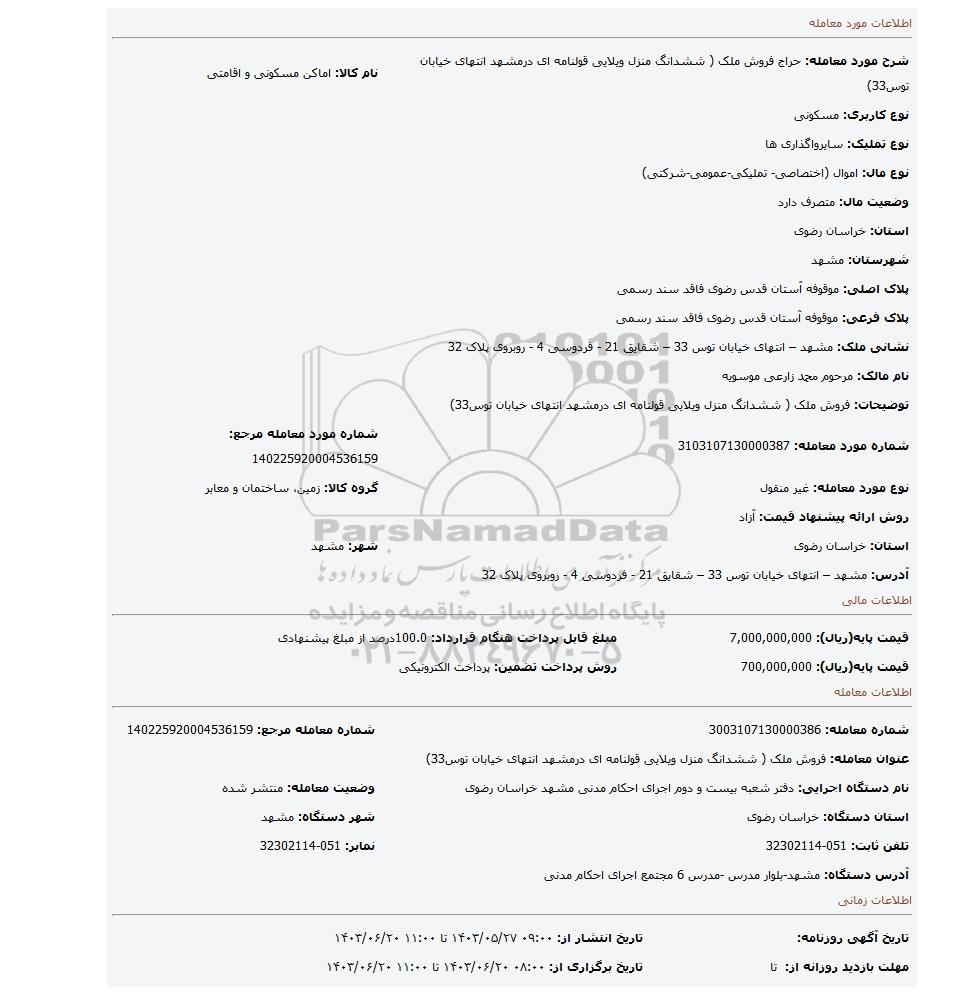 | شرح مورد معامله: حراج فروش ملک ( ششدانگ منزل ویلایی قولنامه ای درمشهد انتهای خیابان توس33) | نام کالا: اماکن مسکونی و اقامتی | |