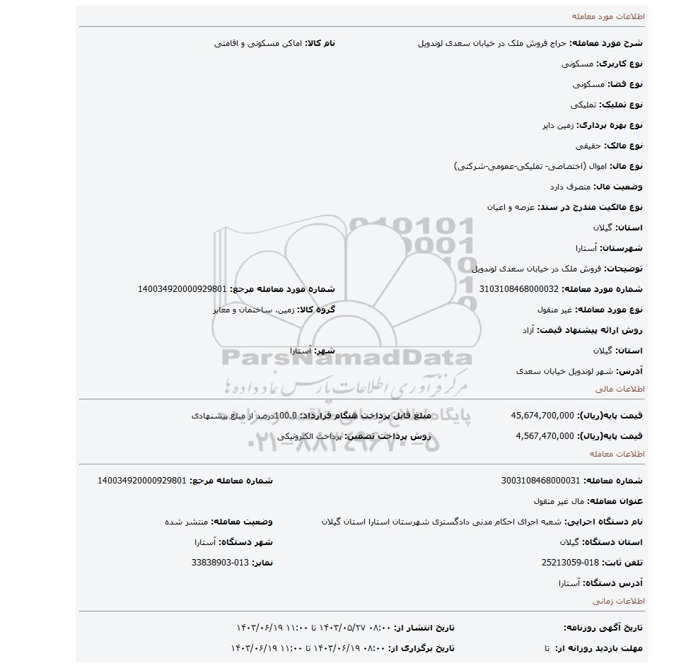 نام دستگاه اجرایی: شعبه اجرای احکام مدنی دادگستری شهرستان استارا استان گیلانوضعیت معامله: منتشر شده