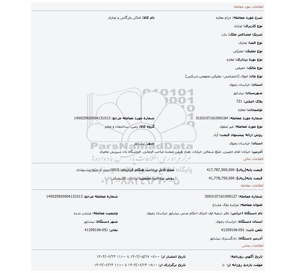 | شماره مورد معامله: 3103107161000164 | شماره مورد معامله مرجع: 140025920004131013 | |