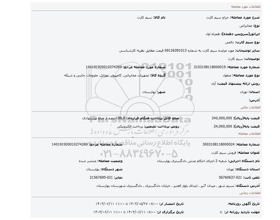 | شرح مورد معامله: حراج سیم کارت | نام کالا: سیم کارت | |