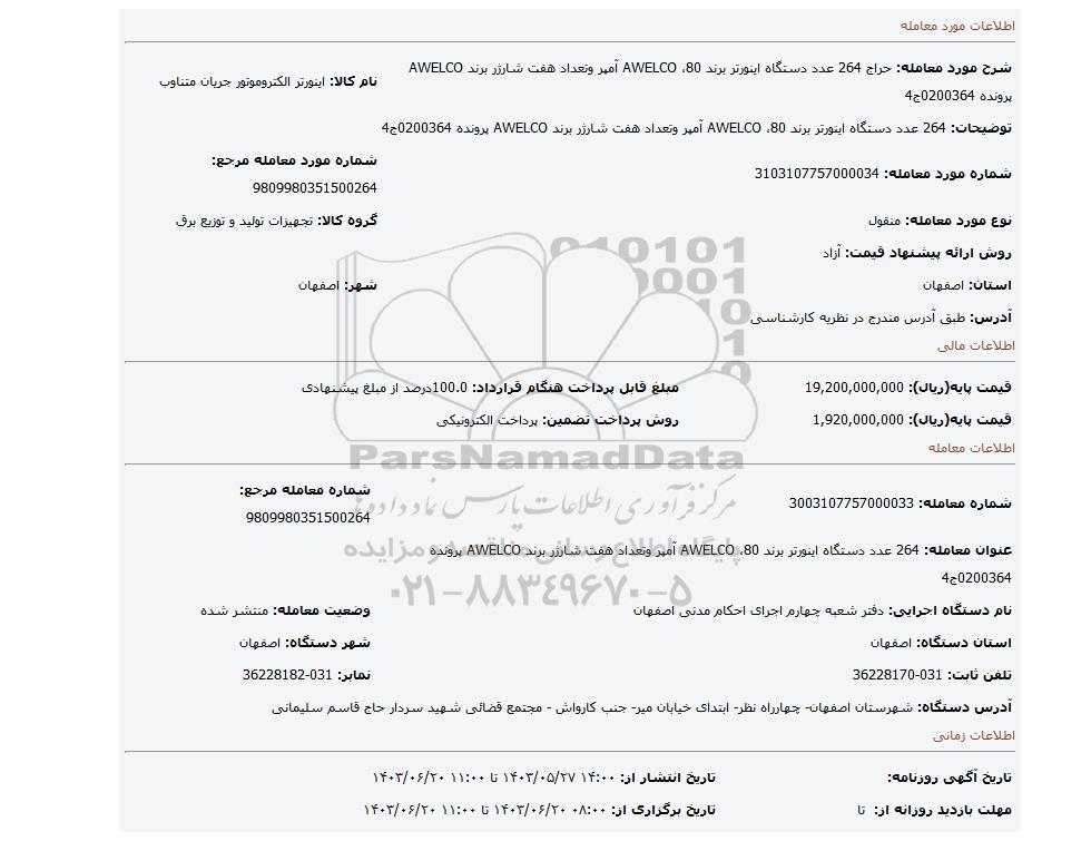 عنوان معامله: 264 عدد دستگاه اینورتر برند AWELCO ،80 آمپر وتعداد هفت شارژر برند AWELCO پرونده 0200364ج4