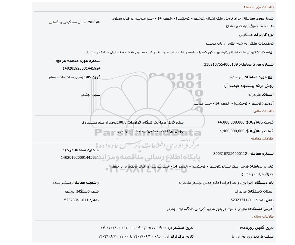 عنوان معامله: فروش ملک نشانی:نوشهر - کوچکسرا - ولیعصر 14 - جنب مدرسه در قبال محکوم به با حفظ حقوق بنیادی و مشاع