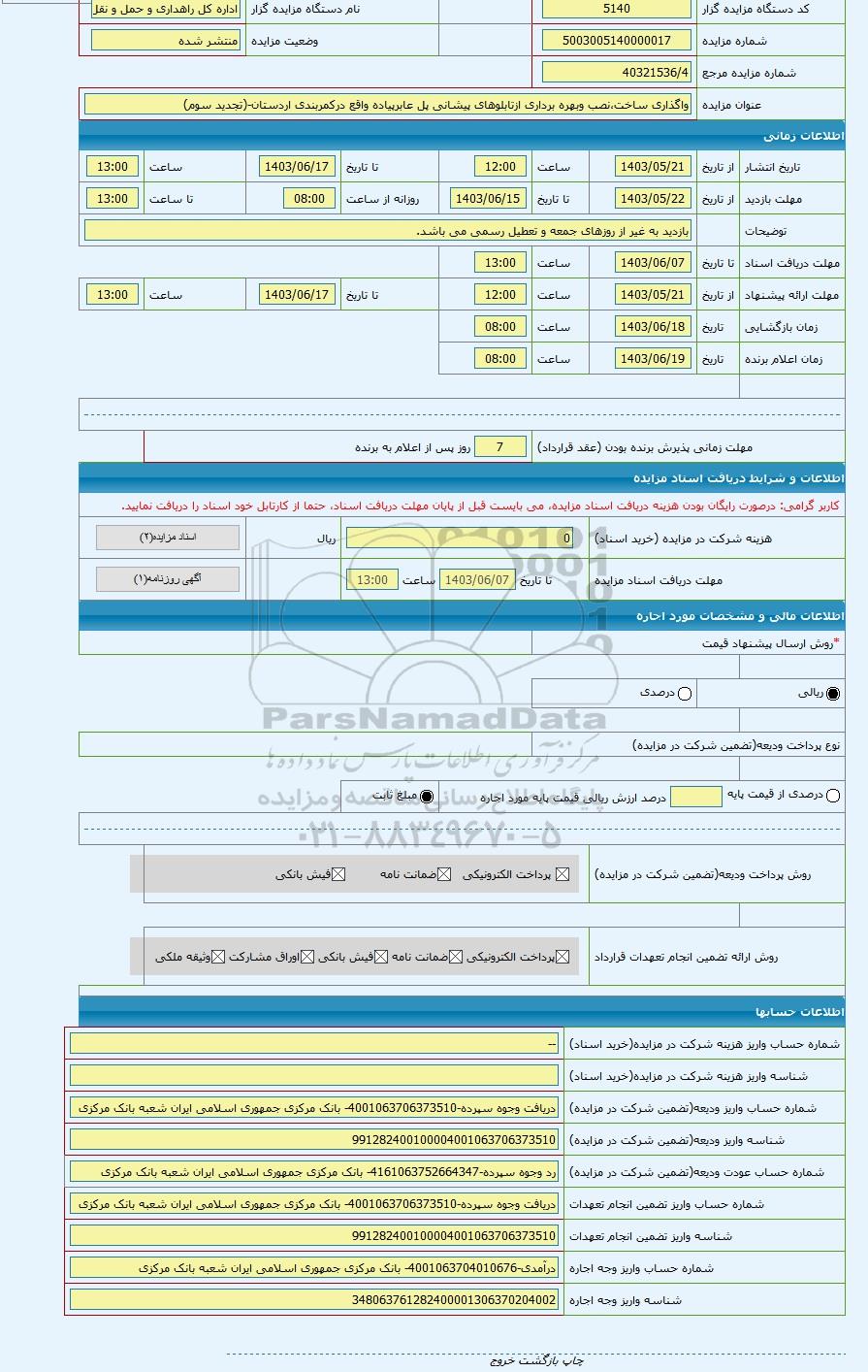 شماره حساب واریز وجه مزایده دریافت وجوه سپرده-4001063706373510- بانک مرکزی جمهوری اسلامی ایران شعبه بانک مرکزی