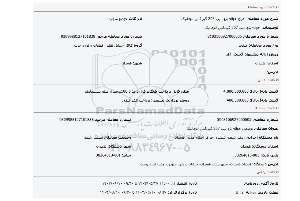 عنوان معامله: توقیفی حواله پژو تیپ 207 گیربکس اتوماتیک