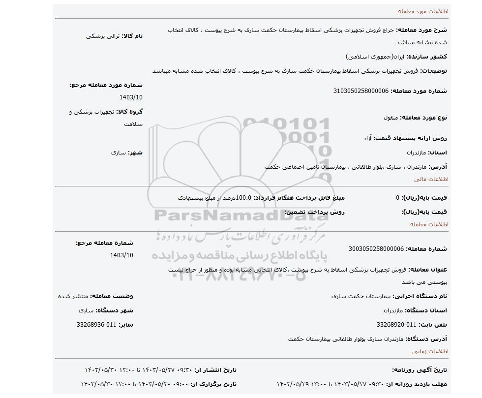| توضیحات: فروش تجهیزات پزشکی اسقاط بیمارستان حکمت ساری به شرح پیوست ، کالای انتخاب شده مشابه میباشد | ||