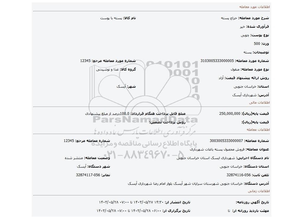 | عنوان معامله: فروش محصول پسته باغات شهرداری | ||