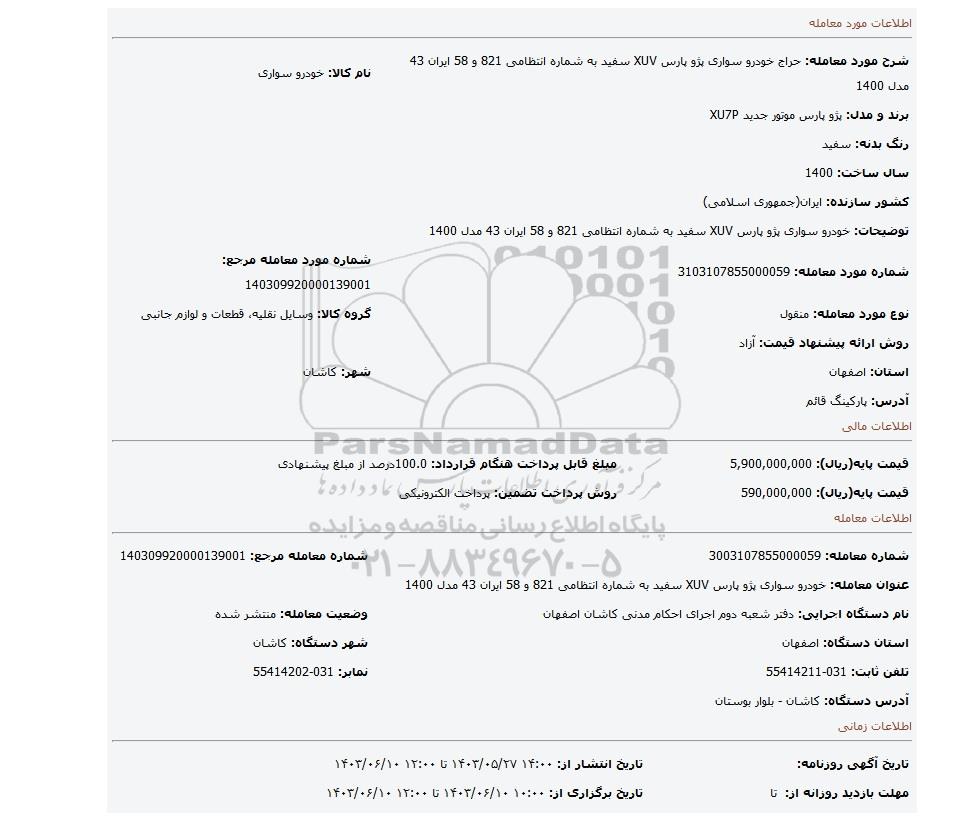 | شرح مورد معامله: حراج خودرو سواری پژو پارس XUV سفید به شماره انتظامی 821 و 58 ایران 43 مدل 1400 | نام کالا: خودرو سواری | |