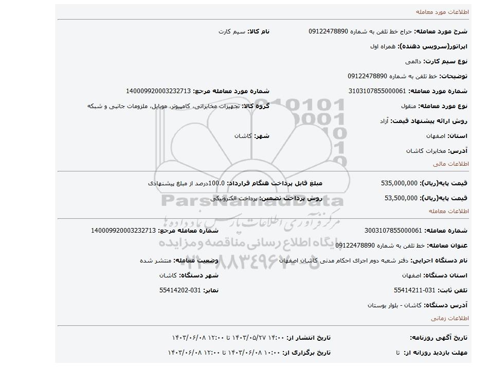 | شماره مورد معامله: 3103107855000061 | شماره مورد معامله مرجع: 140009920003232713 | |