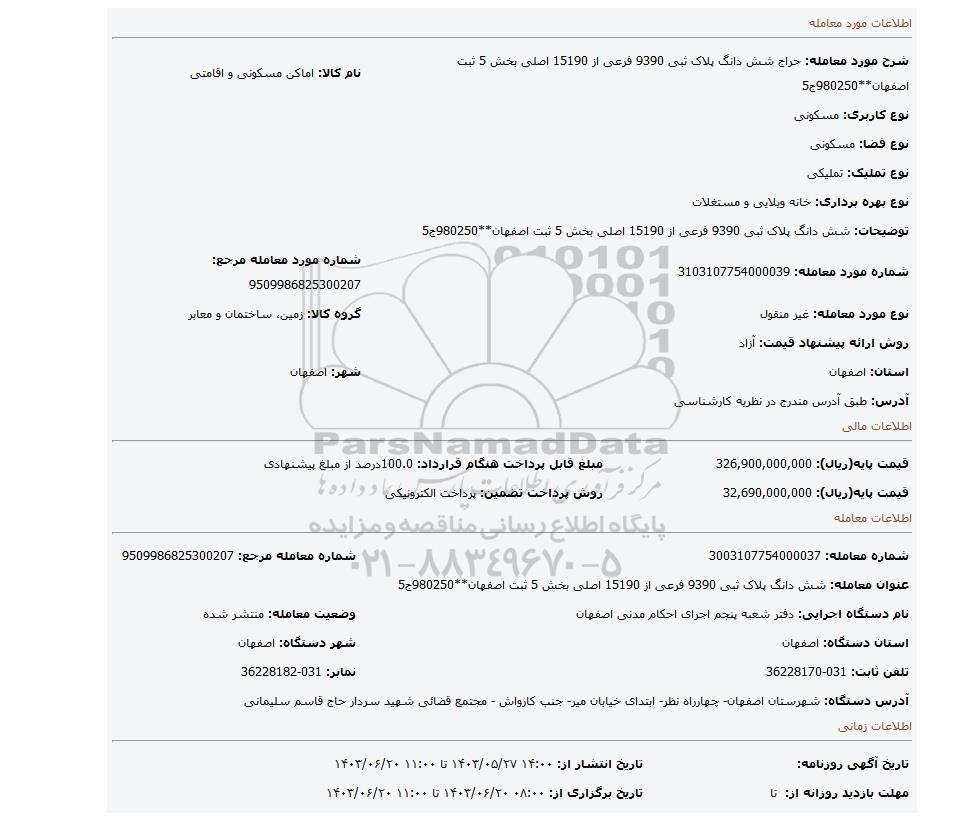 | شرح مورد معامله: حراج شش دانگ پلاک ثبی 9390 فرعی از 15190 اصلی بخش 5 ثبت اصفهان**980250ج5 | نام کالا: اماکن مسکونی و اقامتی | |