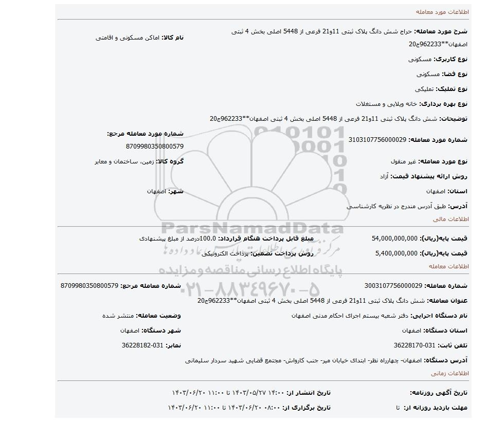 | شرح مورد معامله: حراج شش دانگ پلاک ثبتی 11و21 فرعی از 5448 اصلی بخش 4 ثبتی اصفهان**962233ج20 | نام کالا: اماکن مسکونی و اقامتی | |