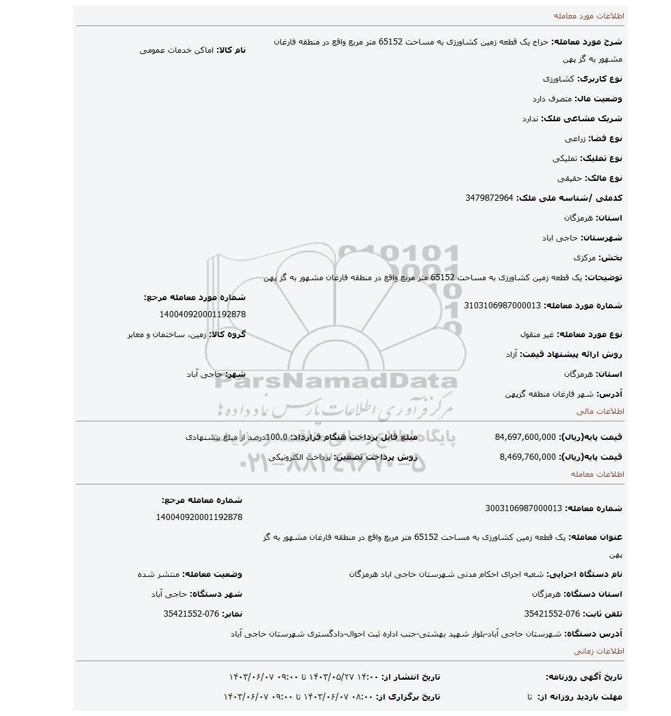 | شرح مورد معامله: حراج یک قطعه زمین کشاورزی به مساحت 65152 متر مربع واقع در منطقه فارغان مشهور به گز پهن | نام کالا: اماکن خدمات عمومی | |