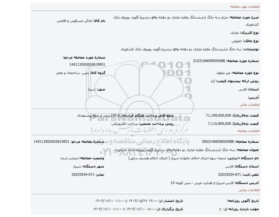 | شرح مورد معامله: حراج سه دانگ ازششدانگ مغازه تجاری دو دهانه واقع درشیراز-گویم- روبروی بانک کشاورزی | نام کالا: اماکن مسکونی و اقامتی | |