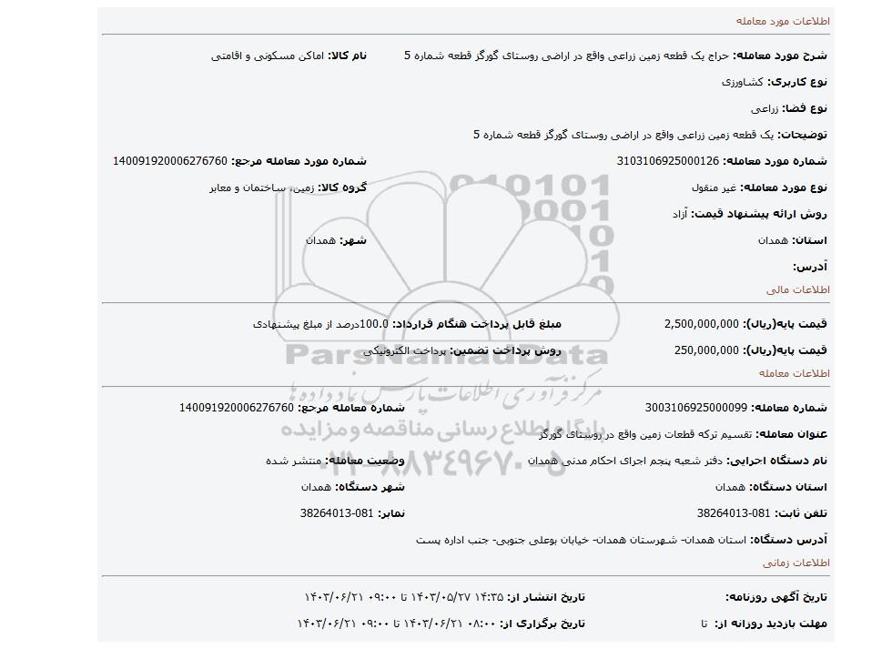 | شماره مورد معامله: 3103106925000126 | شماره مورد معامله مرجع: 140091920006276760 | |
