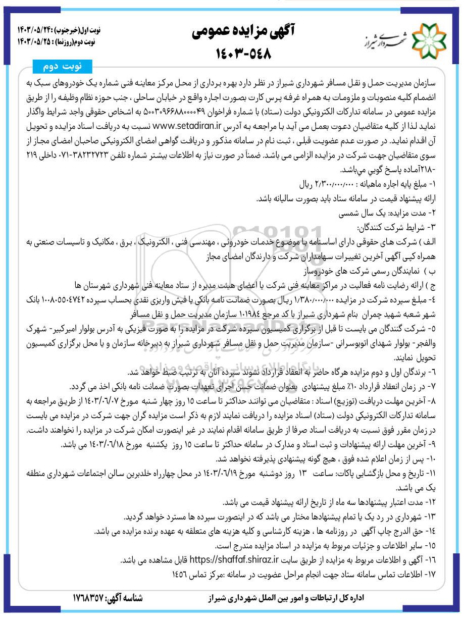 سازمان مدیریت حمل و نقل مسافر شهرداری شیراز در نظر دارد بهره برداری از محل مرکز معاینه فنی شماره یک خودروهای سبک به انضمام کلیه منصوبات و ملزومات به همراه غرفه پرس کارت بصورت اجاره واقع در خیابان ساحلی، جنب حوزه نظام وظیفه را از طریق مزایده عمومی در سامانه تدارکات الکترونیکی دولت (ستاد) با شماره فراخوان 5003096688000049 به اشخاص حقوقی واجد شرایط واگذار نماید لذا از کلیه متقاضیان دعوت بعمل می آید با مراجعه به آدرس www.setadiran.ir نسبت به دریافت اسناد مزایده و تحویل آن اقدام نماید در صورت عدم عضویت قبلی ثبت نام در سامانه مذکور و دریافت گواهی امضای الکترونیکی صاحبان امضای مجاز از سوی متقاضیان جهت شرکت در مزایده الزامی میباشد ضمنا در صورت نیاز به اطلاعات بیشتر شماره تلفن