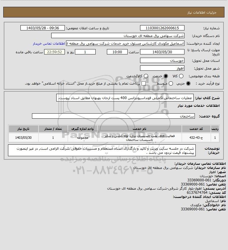 شرح کلی نیاز: عملیات ساختمانی تکمیلی فونداسیونترانس 400 پست ارجان بهبهان مطابق اسناد پیوست.