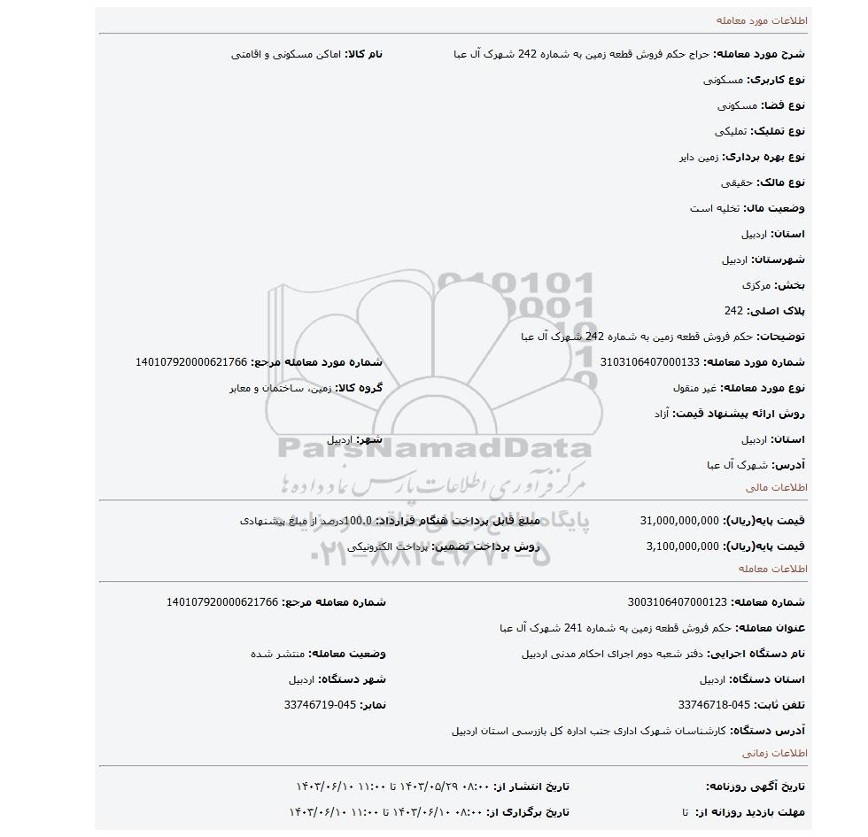شرح مورد معامله: حراج حکم فروش قطعه زمین به شماره 242 شهرک آل عبا | نام کالا: اماکن مسکونی و اقامتی | |