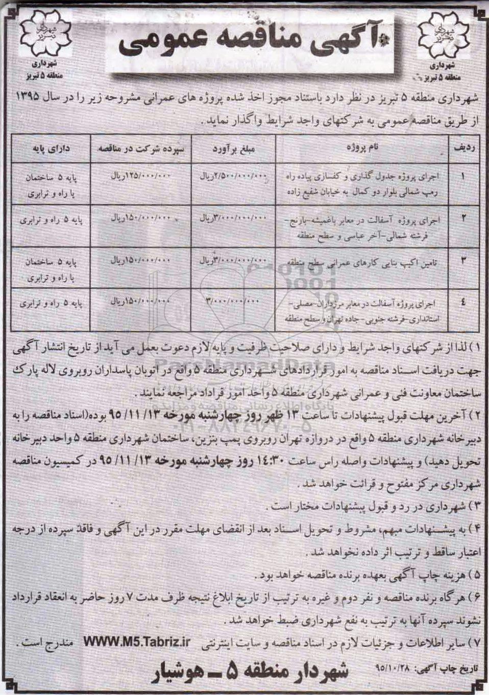 شهرداری منطقه 5 تبریز در نظر دارد باستناد مجوز اخذ شده پروژه های عمرانی مشروحه زیر را در سال 1395 از طریق مناقصه عمومی به شرکتهای واجد شرایط واگذار نماید .