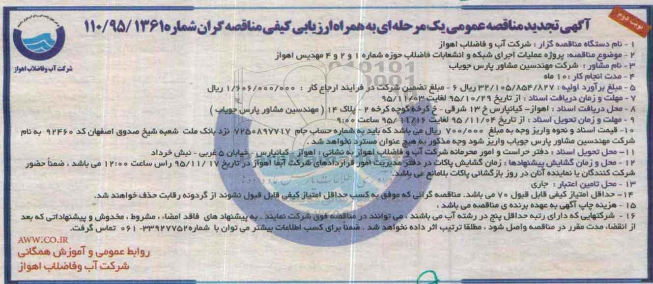 تجدید مناقصه عملیات اجرای شبکه و انشعابات فاضلاب حوزه شماره 1 و 2 و 4 - نوبت دوم از کلیه افراد متخصص و شرکت‌ها واجد شرایط دعوت به عمل می‌آید در مناقصه با کد خبرگزاری پارس نماد: 789061 شرکت نمایند. این مناقصه در تاریخ 1395/11/02 شروع و مهلت آن تا تاریخ 1395/11/03 میباشد.