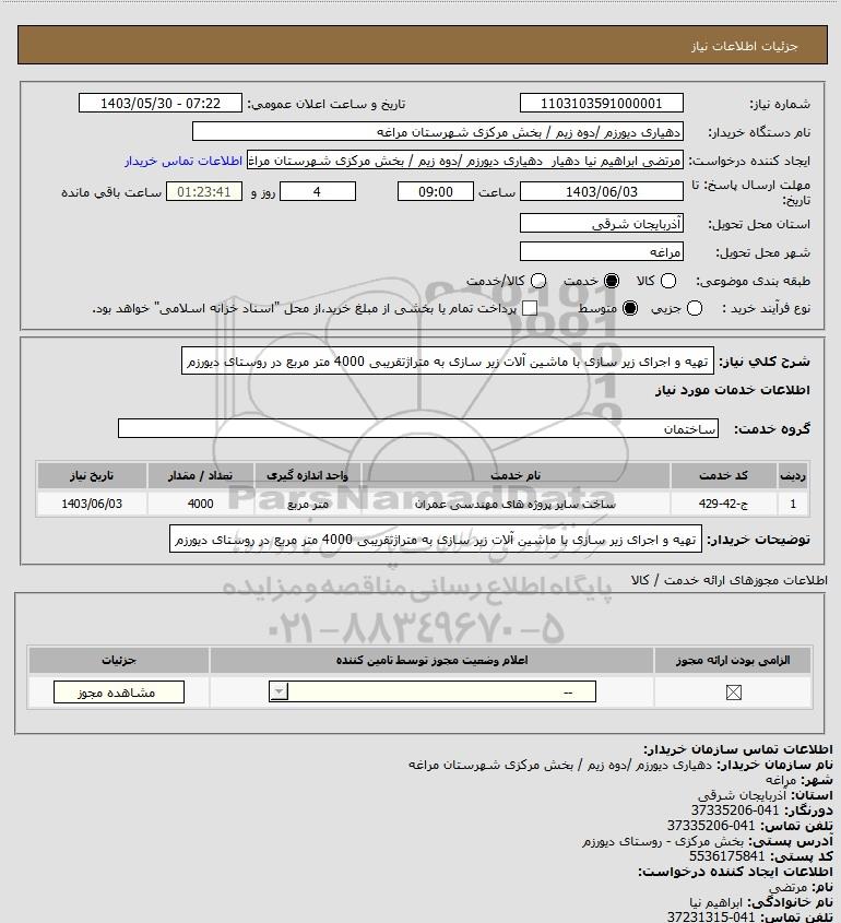 شرح کلی نیاز: تهیه و اجرای زیر سازی با ماشین آلات زیر سازی به متراژتقریبی 4000 متر مربع در روستای دیورزم