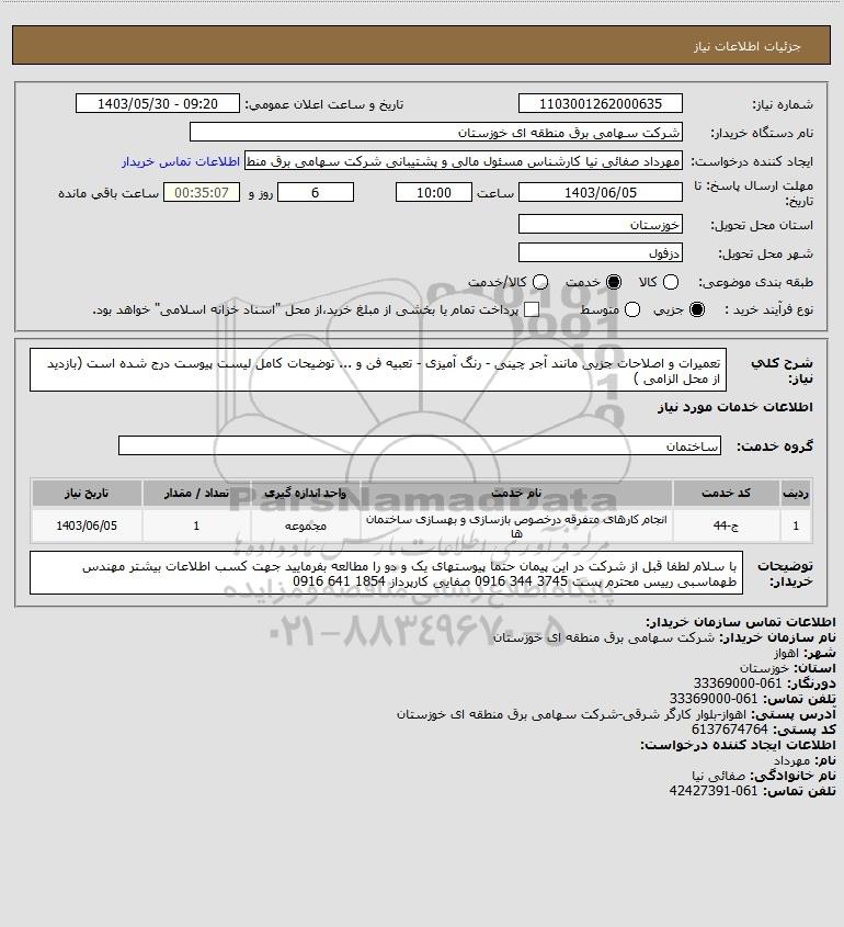 شرح کلی نیاز: تعمیرات و اصلاحات جزیی مانند آجر چینی - رنگ آمیزی - تعبیه فن و ... توضیحات کامل لیست پیوست درج شده است (بازدید از محل الزامی )