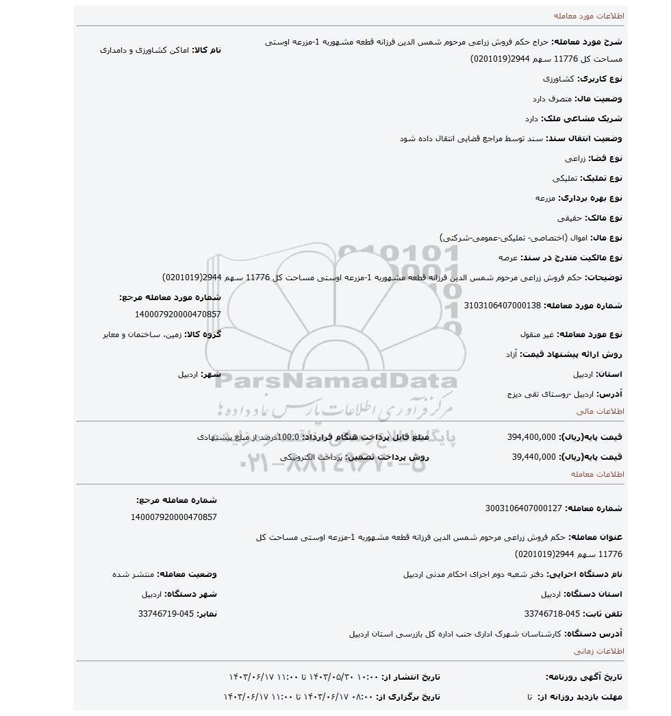 شرح مورد معامله: حراج حکم فروش زراعی مرحوم شمس الدین فرزانه قطعه مشهوربه 1-مزرعه اوستی مساحت کل 11776 سهم 2944(0201019) | نام کالا: اماکن کشاورزی و دامداری | |