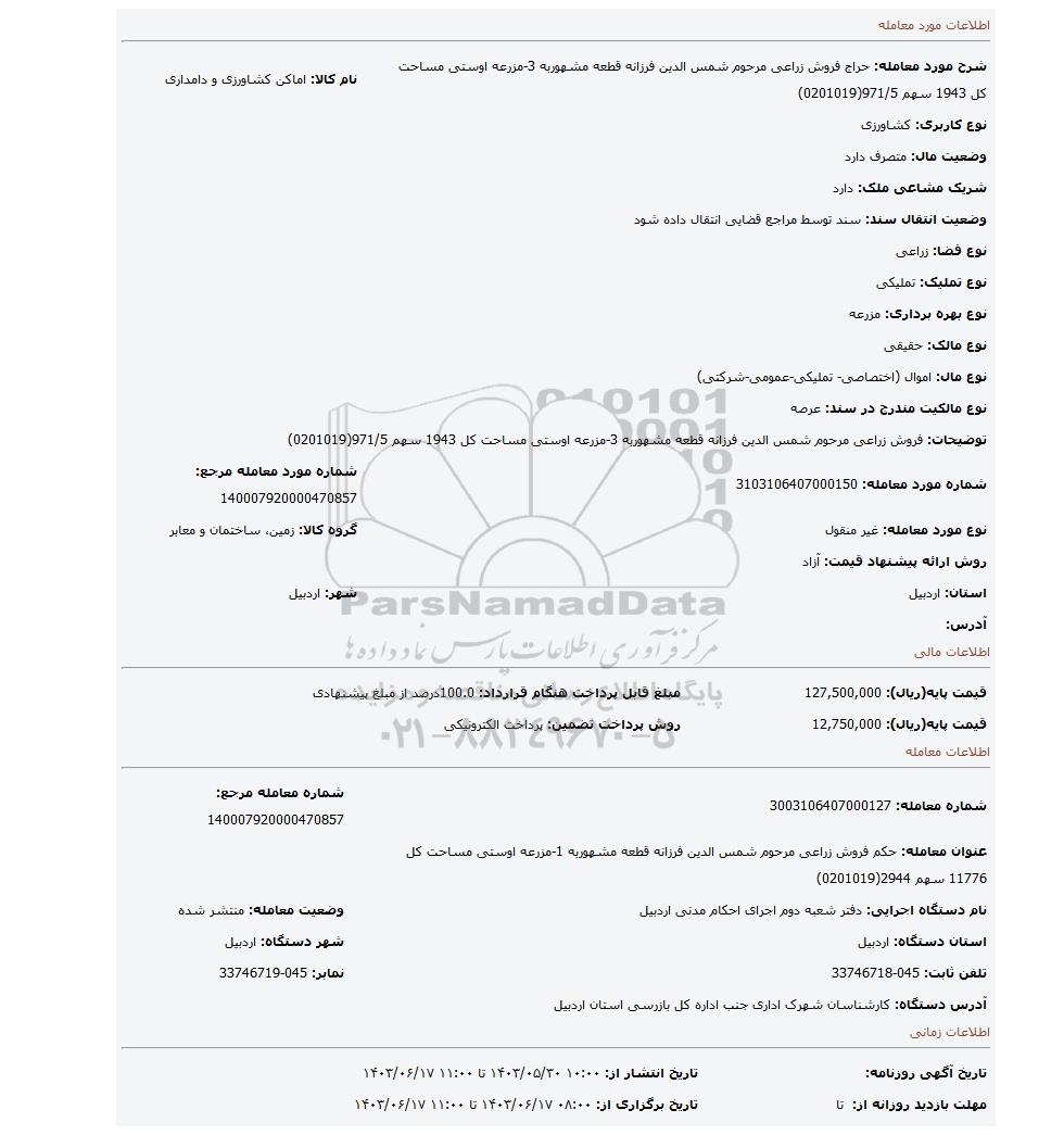 شرح مورد معامله: حراج فروش زراعی مرحوم شمس الدین فرزانه قطعه مشهوربه 3-مزرعه اوستی مساحت کل 1943 سهم 971/5(0201019) | نام کالا: اماکن کشاورزی و دامداری | |