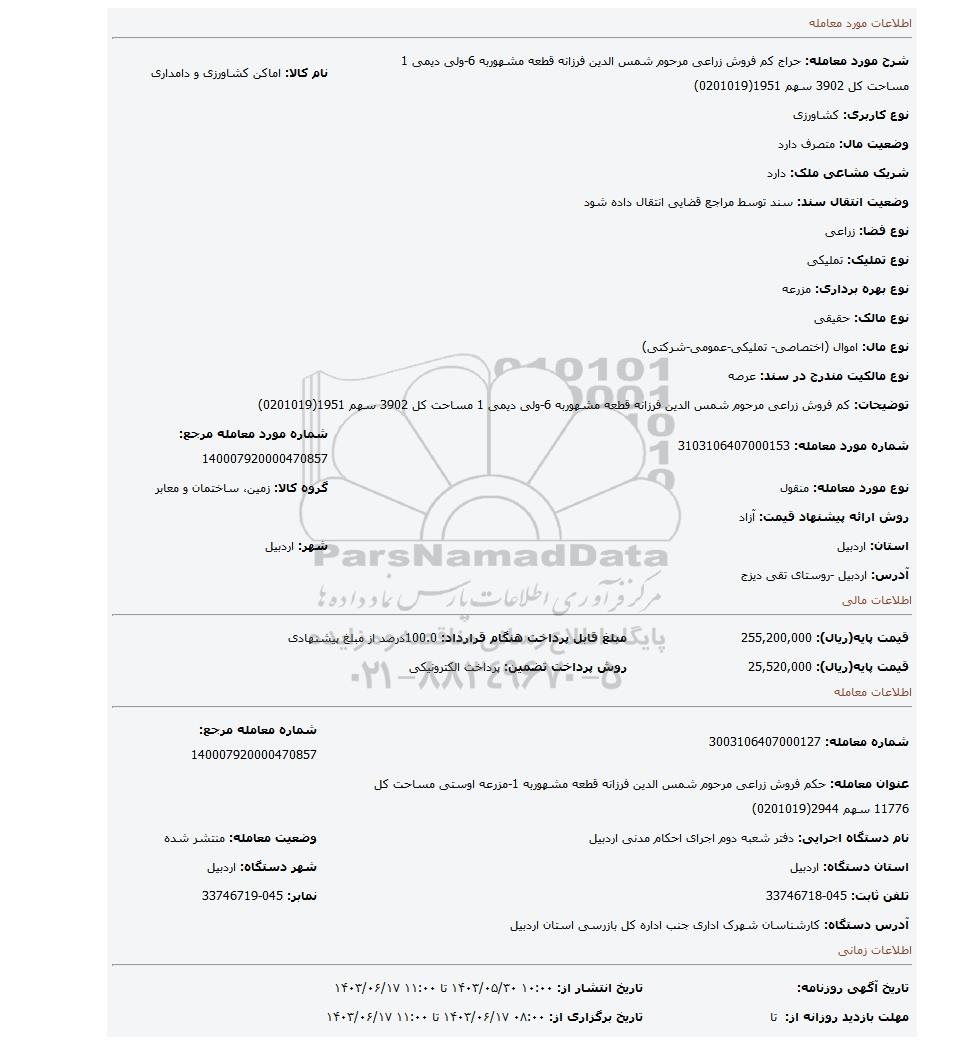عنوان معامله: حکم فروش زراعی مرحوم شمس الدین فرزانه قطعه مشهوربه 1-مزرعه اوستی مساحت کل 11776 سهم 2944(0201019)