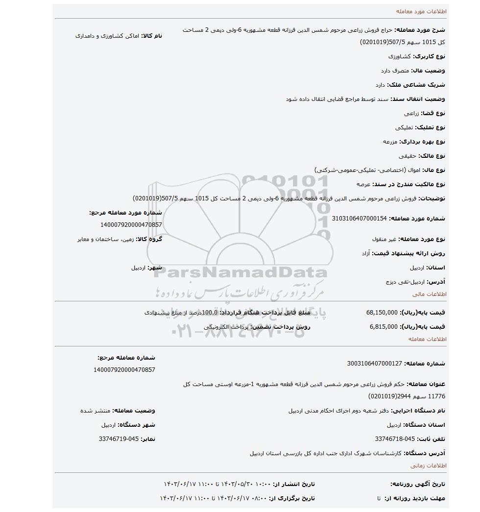 شرح مورد معامله: حراج فروش زراعی مرحوم شمس الدین فرزانه قطعه مشهوربه 6-ولی دیمی 2 مساحت کل 1015 سهم 507/5(0201019)نام کالا: اماکن کشاورزی و دامداری