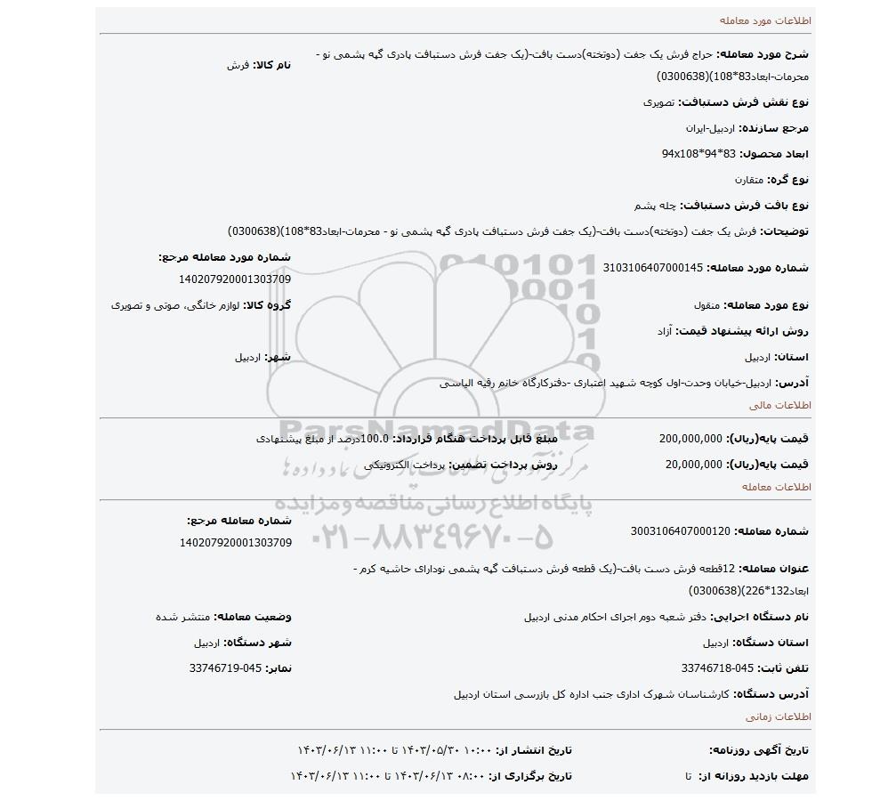 شماره مورد معامله: 3103106407000145 | شماره مورد معامله مرجع: 140207920001303709 | |
