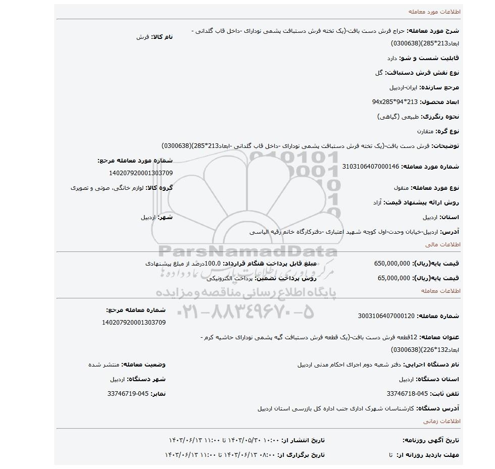 شماره مورد معامله: 3103106407000146 | شماره مورد معامله مرجع: 140207920001303709 | |