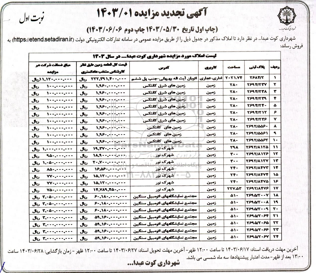 مزایده فروش املاک شامل 23 زمین و 1 ملک اداری- تجاری