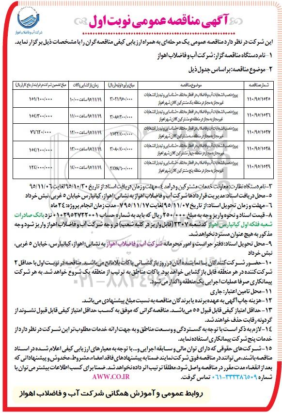 | 110/95/1525 | پروژه نصب انشعابات آب و فاضلاب در اقطار مختلف + شناسایی و تبدیل انشعابات غیرمجاز به مجاز در منطقه یک مشترکین کلان شهر اهواز | 3.021.950.000 | 95.11.19 ساعت 10 | 151.100.000 |