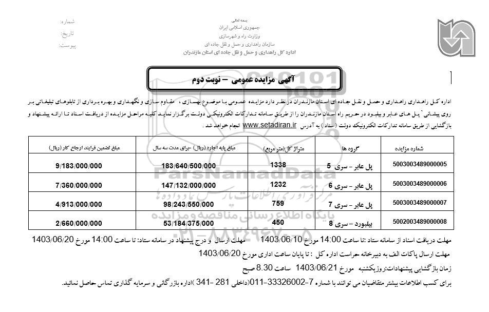اداره کل راهداری راهداری و حمل و نقل جاده ای استان مازندران در نظر دارد مزایده عمومی با موضوع بهسازی، مقاوم سازی و نگهداری و بهره برداری از تابلوهای تبلیغاتی بر روی پیشانی پل های عابر و بیلبورد در حریم راه استان مازندران را از طریق سامانه تدارکات الکترونیکی دولت برگزار نماید کلیه مراحل مزایده از دریافت اسناد تا ارائه پیشنهاد و بازگشایی از طریق سامانه تدارکات الکترونیک دولت ( ستاد ) به آدرس سایت ستاد انجام خواهد شد