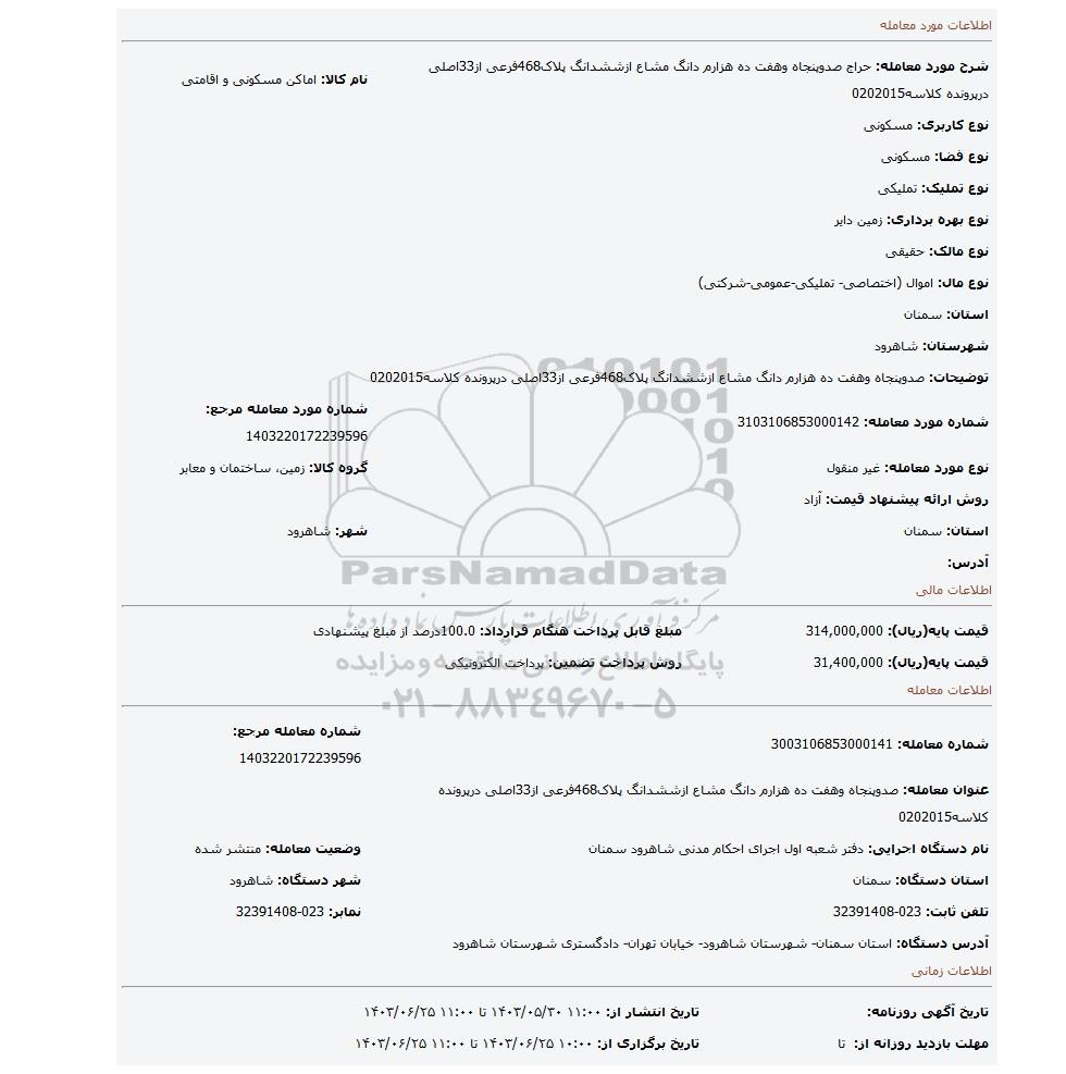 مزایده عمومی مزایده صدوپنجاه وهفت ده هزارم دانگ مشاع ازششدانگ پلاک468فرعی از33اصلی درپرونده کلاسه0202015 برگزار میگردد. از کلیه افراد متخصص و شرکتهای واجد شرایط دعوت به عمل میآید تا در این مزایده با کد خبرگزاری پارس نماد : 7896433 شرکت نمایند تاریخ شروع مزایده : 1403/05/30 مهلت شرکت در مزایده: تا پایان روز 1403/06/25 مکان برگزاری اموال واگذاری استانهای سمنان و دستهبندیهای مربوط به این حراجی املاک و زمین میباشد.