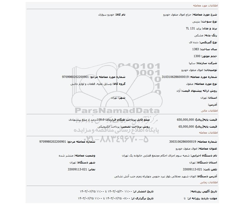 | شرح مورد معامله: حراج اموال منقول خودرو | نام کالا: خودرو سواری | |