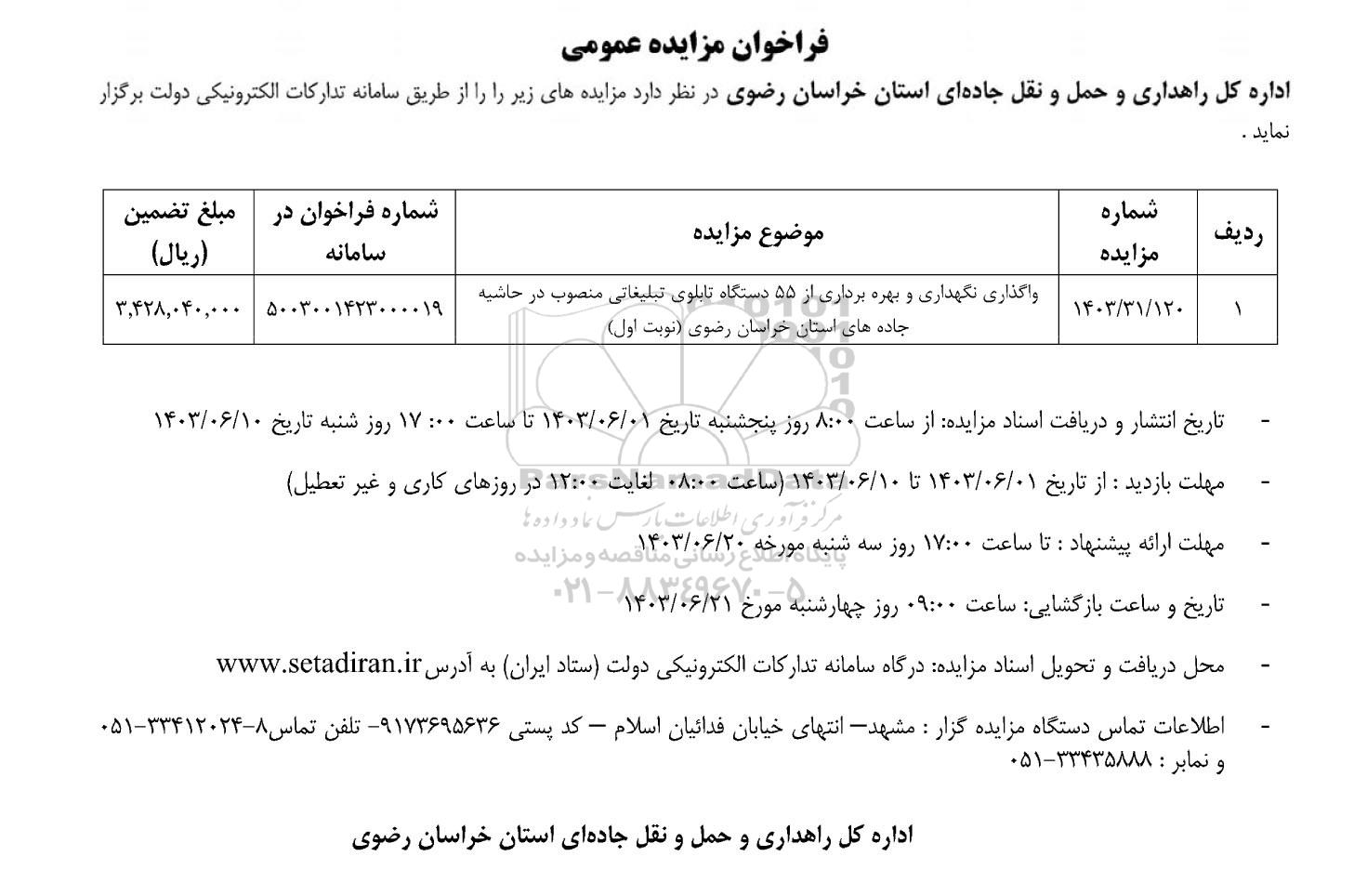 | 1403/31/120 | واگذاری نگهداری و بهره برداری از 55 دستگاه تابلوی تبلیغاتی منصوب در حاشیه جاده های استان خراسان ضوی (نوبت اول) | 5003001423000019 | 3.428.040.000 |