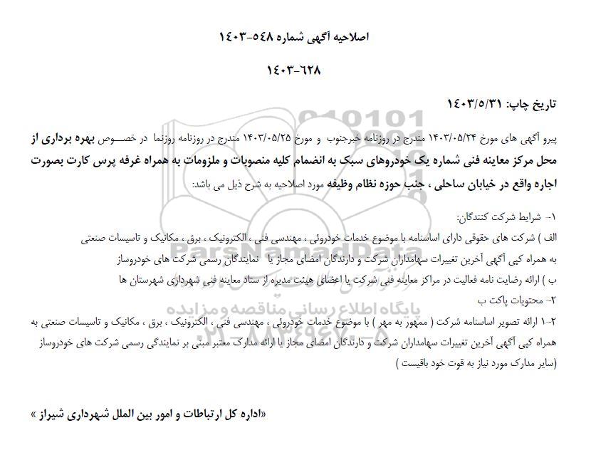پیرو آگهی های مورخ 1403.5.24 مندرج در روزنامه خبر جنوب و مورخ 1403.5.25 مندرج در روزنامه روزنما در خصوص بهره برداری از محل مرکز معاینه فنی شماره یک خودروهای سبک به انضمام کلیه منصوبات و ملزومات به همراه غرفه پرس کارت بصورت اجاره واقع در خیابان ساحلی، جنب حوزه نظام وظیفه مورد اصلاحیه به شرح ذیل می باشد.